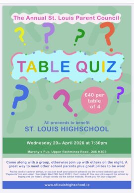 The annual Parents’ Council Table Quiz will be held on Wednesday, the 29th of April, in Murphy’s pub, Upper Rathmines...
